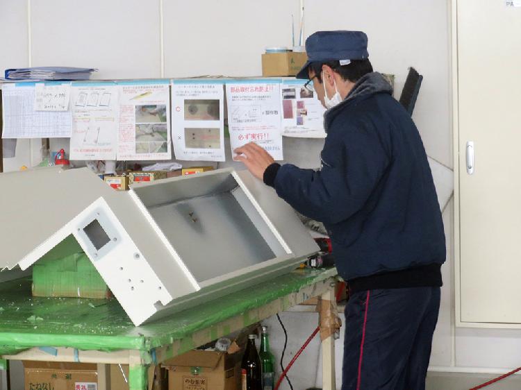 当社は、板金加工部品の表面処理として、有機溶剤などの溶媒を用いない固体の粉末塗料を使用して、大小さまざまな部品を